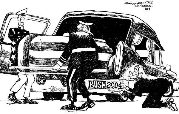 Too little too late. On Sunday, I watched House Minority Leader Nancy Pelosi on Meet the Press. Tim Russert asked Pelosi about the differences on Iraq between Bush and Kerry, particularly in light of Bush's movement toward international cooperation after a year of go-it-alone defiance of the majority of the international community. Unfortunately, Pelosi was not adequately prepared for this softball and she whiffed on it rather than knocking it out of the park. The correct answer is that Kerry will be successful at mending the fences which were demolished by W. marching through with his armies like Sherman through Atlanta. A new broom sweeps clean. Get it? Or do you need another metaphor? |