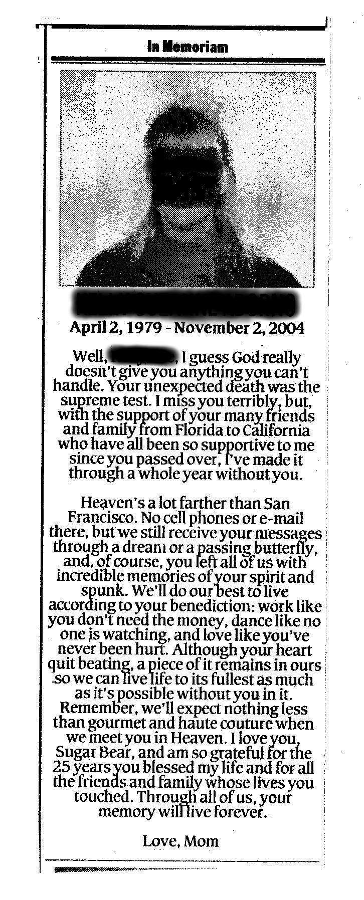 It's not that I'm unsympathetic to people who have lost loved ones, particularly parents whose children predecease them. Nor am I critical of those same folks whose faith in God and Heaven give them comfort and strength in times of devastating losses. And yes, it is implicit in faith that one accepts certain things which cannot be empirically proven. But I draw the line somewhere well short of taking out ads in newspapers with messages to the dead. I am not a student of the Bible but, I ask, in what concept of Heaven, the Kingdom of God, do you spend eternity subscribing to the Miami Herald? Frankly, if I were a believer, I'd hope for better. If you can communicate with the dead, why would it be in a newspaper? God created the world and all living things long before newspapers or even the written word. So, if this communication thing is evolving, why not use e-mail or instant messages? I don't plan on going anywhere without my Blackberry. And how about communicating with those loved ones who don't make it to Heaven? Take out an ad in the National Enquirer. Or, better yet, pay for an ad in The Daily Rant! |