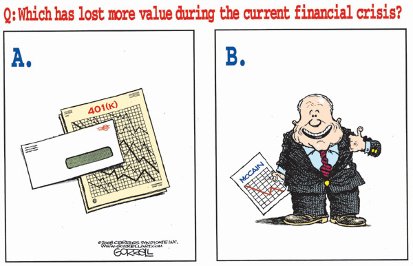 "I suppose the McCain campaign's hope is that when there's a big crisis, people will go for age and experience. The question is, who in this crisis looked more presidential, calm and un-flustered? It wasn't John McCain who, as usual, substituting vehemence for coherence, said 'let's fire somebody.' And picked one of the most experienced and conservative people in the administration, Chris Cox, and for no apparent reason... It was un-presidential behavior by a presidential candidate." -