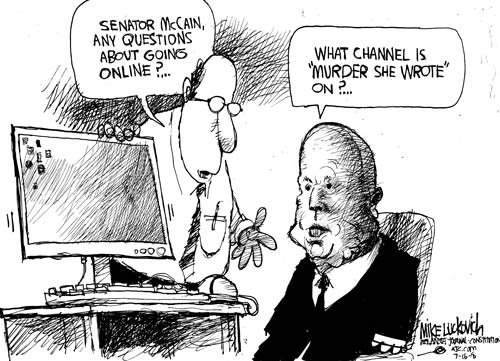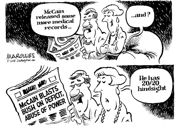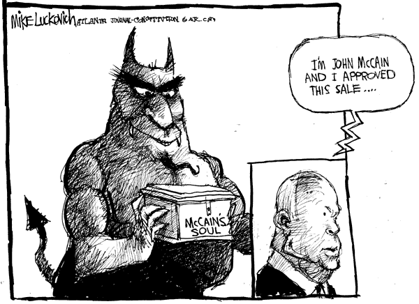 But, gee whiz, what would justify making this serious accusation against this war hero, this self-described straight-talking maverick, this man of honor? Well, after his 2000 presidential bid was over, McCain called for the removal of the Confederate battle flag from atop the South Carolina Statehouse, acknowledging that his refusal to take such a stance during his primary battle for South Carolina was a "sacrifice of principle for personal ambition. I feared that if I answered honestly, I could not win the South Carolina primary. So I chose to compromise my principles."  Do you think that the 2008 McCain, chastened by his moral lapse in 2000, is less ambitious and is now committed to the high road (as in I'd rather lose an election than lie to the electorate)?