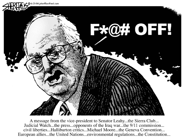 Jay Leno: "On the Senate floor, Dick Cheney flipped out and told Senator Pat Leahy to go f-himself. Can you believe that? Aren't these the same guys trying to fine Howard Stern for bad language?"