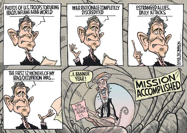 On May 1, President Bush said, "A year ago I did give the speech from the carrier saying we had achieved an important objective, accomplished a mission, which was the removal of Saddam Hussein. As a result, there are no longer torture chambers or mass graves or rape rooms in Iraq."