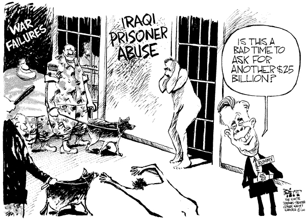 What does this mean? What are the consequences? Is Rumsfeld's responsibility limited to being contrite in his appearance in the Senate?I don't disagree with Rumsfeld that some of the calls for his resignation are politically motivated. And I don't disagree with Rumsfeld that it would be wrong to resign solely over politics. However, Rumsfeld was less than honest when he only acknowledged that it is "possible" that his resignation would demonstrate to the world that America takes the prison abuse scandal very seriously and that his resignation would significantly mitigate the critical view many in the world have of our abuse of Iraqi prisoners.