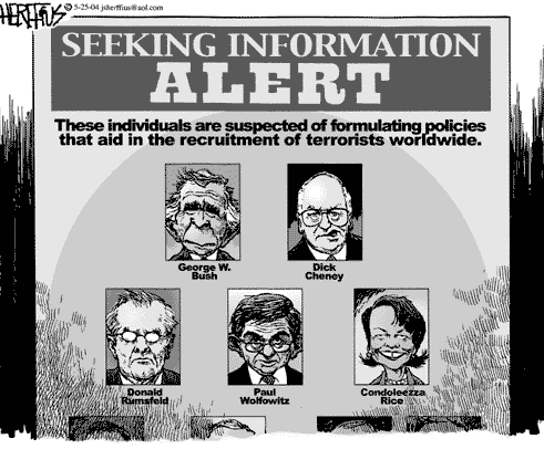 From the Rant Archives... March 17, "our world-be-damned war in Iraq, will continue to fuel the fires of terrorism assuring that that war will go on and on." April 14, "in the name of fighting terrorism, Bush is fueling it." May 4, "just as images of 9/11 fired the patriotism of Americans, the abuses of Iraqi prisoners will be a boon to recruiting by al Qaeda and other terrorist organizations." May 29, "Bush is campaigning on his strength in combating terrorism." Definition: CHUTZPAH