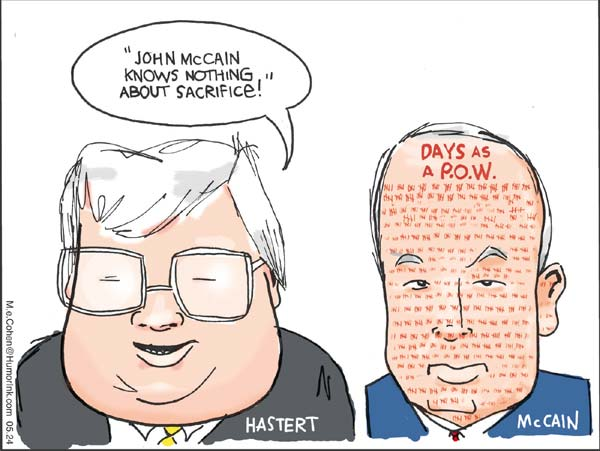Last week, Senator McCain gave a speech excoriating both political parties for refusing to sacrifice their tax-cutting and spending agendas in a time of war. The next day, House Speaker Hastert shot back: "If you want to see sacrifice, John McCain ought to visit our young men and women at Walter Reed (Army Medical Center) and Bethesda (Naval Hospital). There's the sacrifice in this country." House Majority Leader Tom DeLay and House Armed Services Committee Chairman Duncan Hunter castigated Senate Republicans for continuing their public investigations of the Abu Ghraib prison abuse scandal, accusing them of undermining the war effort.